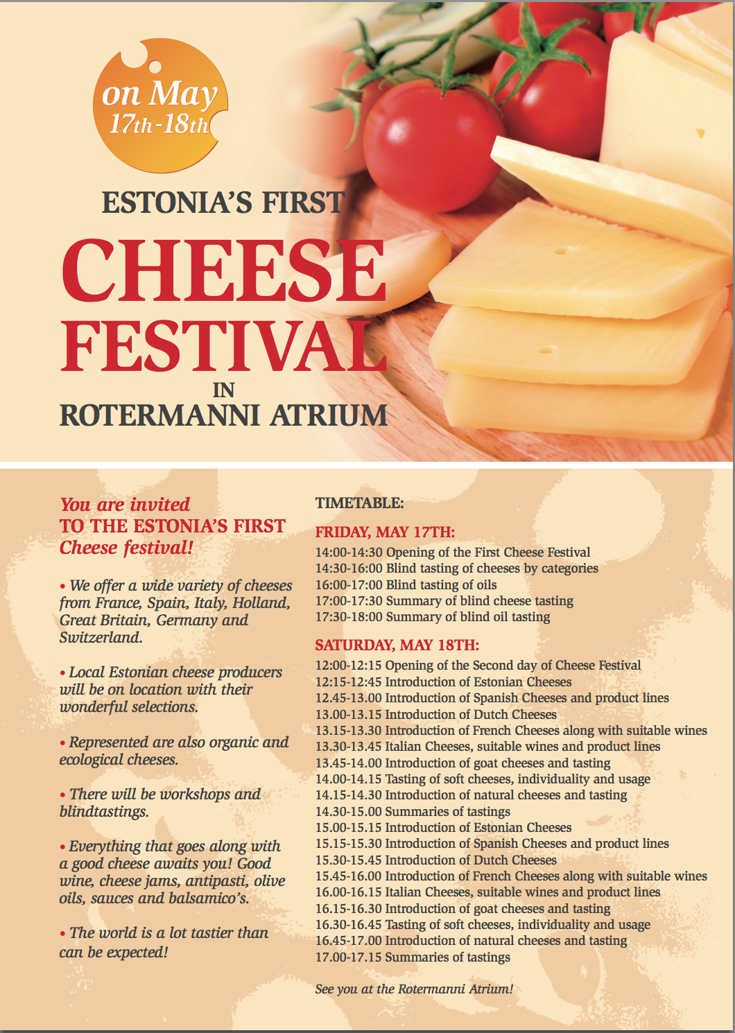 Yummy If you love cheese and you're in Estonia this weekend ... Selasa, 26 Oktober 2004 Tambah Komentar Edit ... then you should head to the Rotermanni Quarter this Friday and Saturday for Estonia's first cheese festival: Bagikan Artikel ini